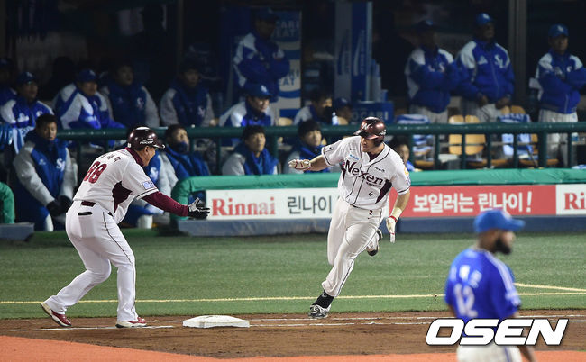 5회말 넥센 공격 1사 주자없는 상황 로티노가 삼성 선발 장원삼을 상대로 선제 좌월 솔로포를 터트리고 심재학 코치와 인사를 나누며 그라운드를 돌고 있다.