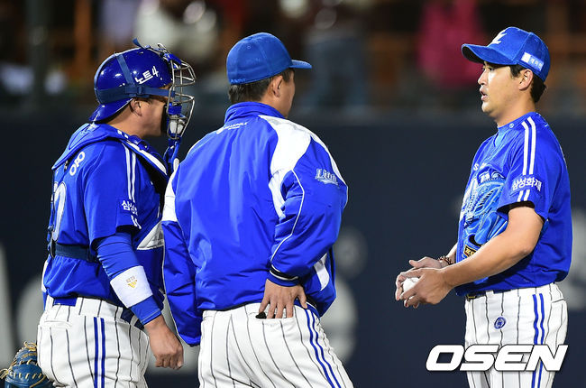 7일 오후 서울 목동야구장에서 열린 '2014 한국야쿠르트 세븐 프로야구 포스트시즌' 넥센 히어로즈와 삼성 라이온즈의 한국시리즈 3차전 경기,5회말 1사 넥센 로티노에게 선취 솔로홈런을 허용한 삼성 선발투수 장원삼이 김태한 투수코치와 이야기를 나누고 있다.