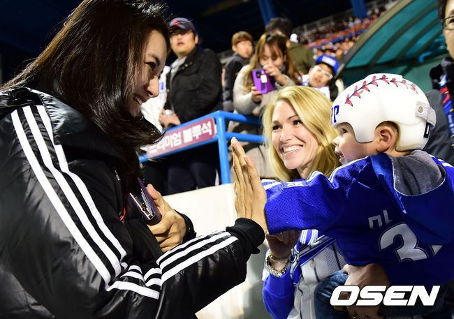 마틴 아들과 이승엽 아내 이송정이 인사를 나누고 있다.