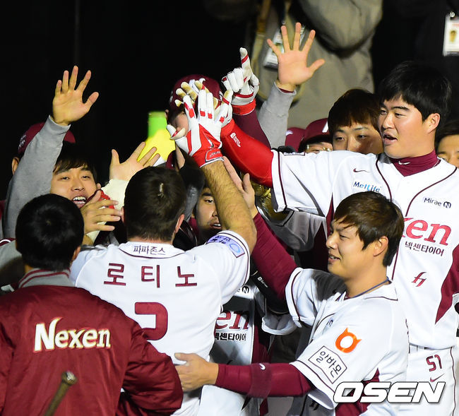 7일 오후 서울 목동야구장에서 열린 '2014 한국야쿠르트 세븐 프로야구 포스트시즌' 넥센 히어로즈와 삼성 라이온즈의 한국시리즈 3차전, 5회말 1사에서 넥센 로티노가 선제 솔로포를 날리고 더그아웃에서 동료선수들과 기뻐하고 있다.