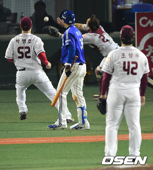 6회초 삼성 공격 1사 1루 상황 이승엽이 포수 파울플라이로 물러나고 있다.