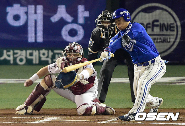 6회초 삼성 공격 2사 1루 상황 김헌곤이 좌익수 방면 2루타를 날리고 있다.