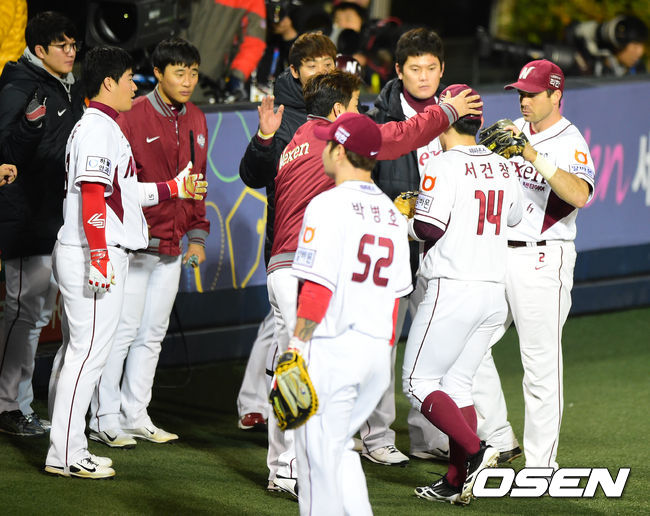7일 오후 서울 목동야구장에서 열린 '2014 한국야쿠르트 세븐 프로야구 포스트시즌' 넥센 히어로즈와 삼성 라이온즈의 한국시리즈 3차전, 6회초 2사 2,3루에서 넥센 서건창이 삼성 진갑용의 타구를 라인드라이브로 처리하고 동료선수들의 격려를 받고 있다.