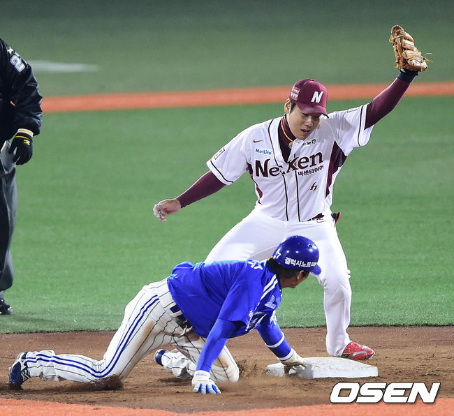 7회초 삼성 공격 1사 1루 상황 박한이 타석 때 주자 김상수가 2루 도루를 시도하다 넥센 유격수 강정호의 태그에 걸려 아웃되고 있다.
