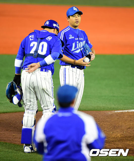 7일 오후 서울 목동야구장에서 열린 '2014 한국야쿠르트 세븐 프로야구 포스트시즌' 넥센 히어로즈와 삼성 라이온즈의 한국시리즈 3차전, 7회말 1사 1루에서 삼성 선발 장원삼이 마운드를 내려오고 있다.