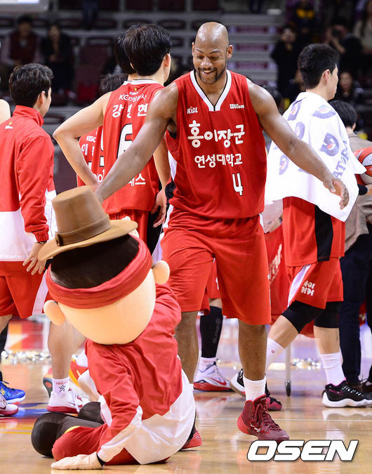 7일 오후 안양시 안양실내체육관에서 열린 '2014-2015 KCC 프로농구' 안양 KGC인삼공사와 서울 SK의 경기 종료 후 윌리암스가 KGC 마스코트와 장난을 치고 있다.