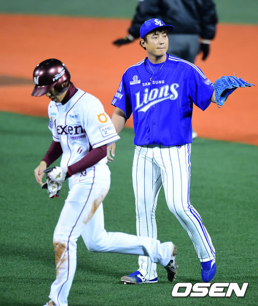 7일 오후 서울 목동야구장에서 열린 '2014 한국야쿠르트 세븐 프로야구 포스트시즌' 넥센 히어로즈와 삼성 라이온즈의 한국시리즈 3차전, 7회말 1사 1루에서 넥센 유재신이 삼성 안지만의 견제에 걸려 나바로에 태그아웃당하고 있다.