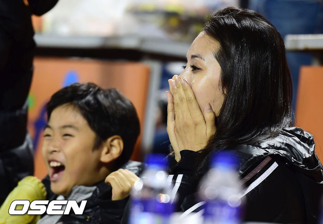 8회초 2사 1루 삼성 이승엽이 2루수와 중견수 사이에 떨어지는 행운의 동점 1타점 적시타를 날리자 이승엽 아내 이송정이 기뻐하고 있다.