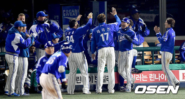 8회초 삼성 공격 2사 1루 상황 이승엽의 1타점 동점 적시타타 때 홈을 밟은 박해민이 더그아웃 동료들과 환호하고 있다.