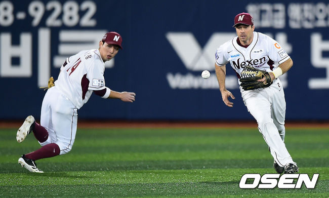 7일 오후 서울 목동야구장에서 열린 '2014 한국야쿠르트 세븐 프로야구 포스트시즌' 넥센 히어로즈와 삼성 라이온즈의 한국시리즈 3차전 경기,8회초 2사 1루 삼성 이승엽의 2루수와 중견수 사이에 떨어지는 행운의 동점 1타점 적시타때 넥센 이택근과 서건창이 타구를 놓치고 있다.