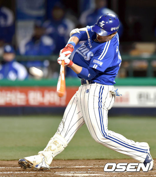7일 오후 서울 목동야구장에서 열린 '2014 한국야쿠르트 세븐 프로야구 포스트시즌' 넥센 히어로즈와 삼성 라이온즈의 한국시리즈 3차전, 9회초 2사 1루 박한이가 역전 투런 홈런을 치고 있다.