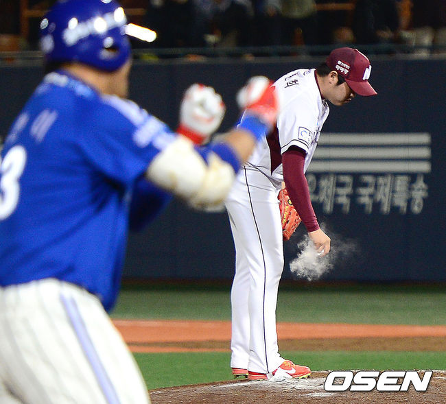 7일 오후 서울 목동야구장에서 열린 '2014 한국야쿠르트 세븐 프로야구 포스트시즌' 삼성 라이온즈와 넥센 히어로즈의 한국시리즈 3차전 9회초 2사 1루 넥센 한현희가 삼성 박한이에게 투런 홈런을 허용한 뒤 아쉬워하고 있다.