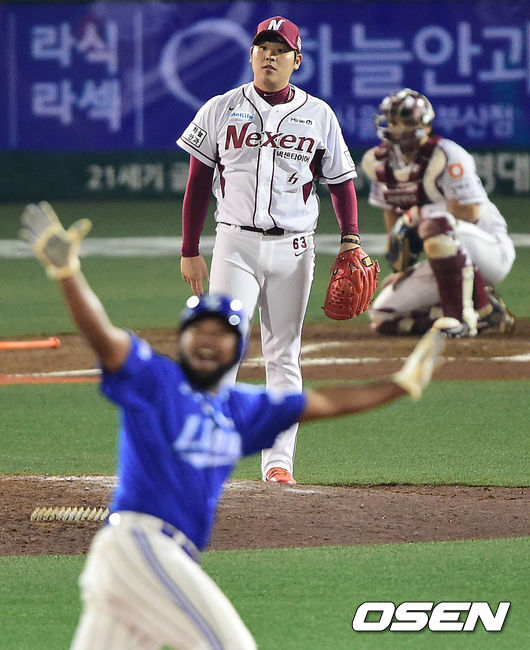 9회초 삼성 공격 2사 1루 상황 넥센 투수 한현희가 박한이에게 역전 중월 투런포를 허용한 뒤 아쉬워하고 있다.