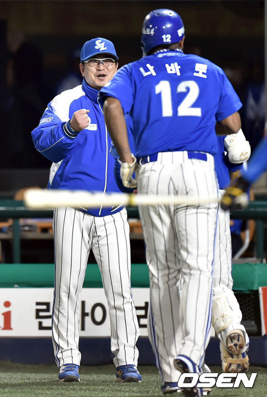 7일 오후 서울 목동야구장에서 열린 '2014 한국야쿠르트 세븐 프로야구 포스트시즌' 넥센 히어로즈와 삼성 라이온즈의 한국시리즈 3차전, 9회초 2사 1루 박한이가 역전 투런 홈런을 치자 류중일 감독이 환호하고 있다.