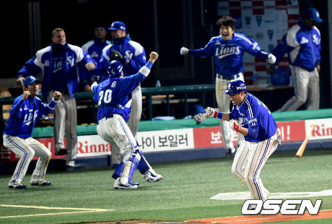 9회초 삼성 공격 2사 1루 상황 박한이가 넥센 투수 한현희를 상대로 역전 중월 투런포를 터트리고 그라운드를 돌며 환호하고 있다.