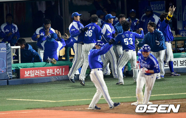 9회초 삼성 공격 2사 1루 상황 박한이가 역전 중월 투런포를 날리고 그라운드를 도는 가운데 삼성 더그아웃 선수들이 환호하고 있다./dreamer@osen.co.kr