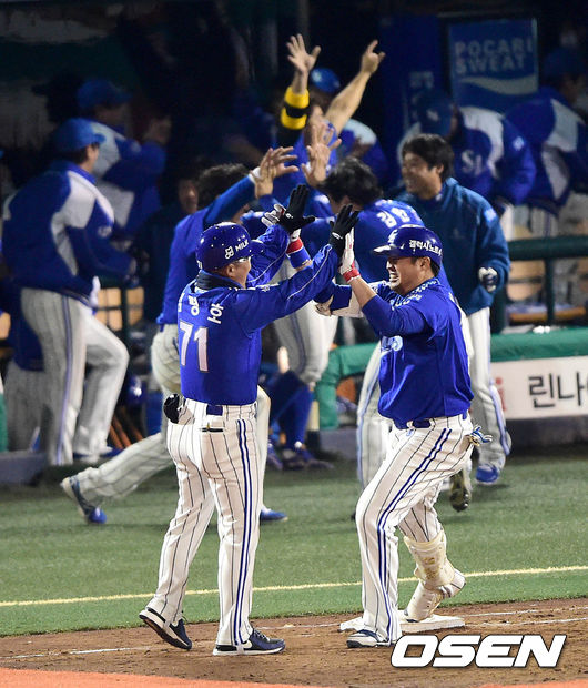 9회초 삼성 공격 2사 1루 상황 박한이가 역전 중월 투런포를 날리고 그라운드를 돌며 김평호 코치와 하이파이브를 나누고 있다./dreamer@osen.co.kr