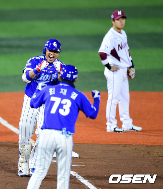 9회초 2사 1루에서 삼성 박한이가 역전 투런포를 날리고 김재걸 코치와 하이파이브를 하고 있다./jpnews@osen.co.kr