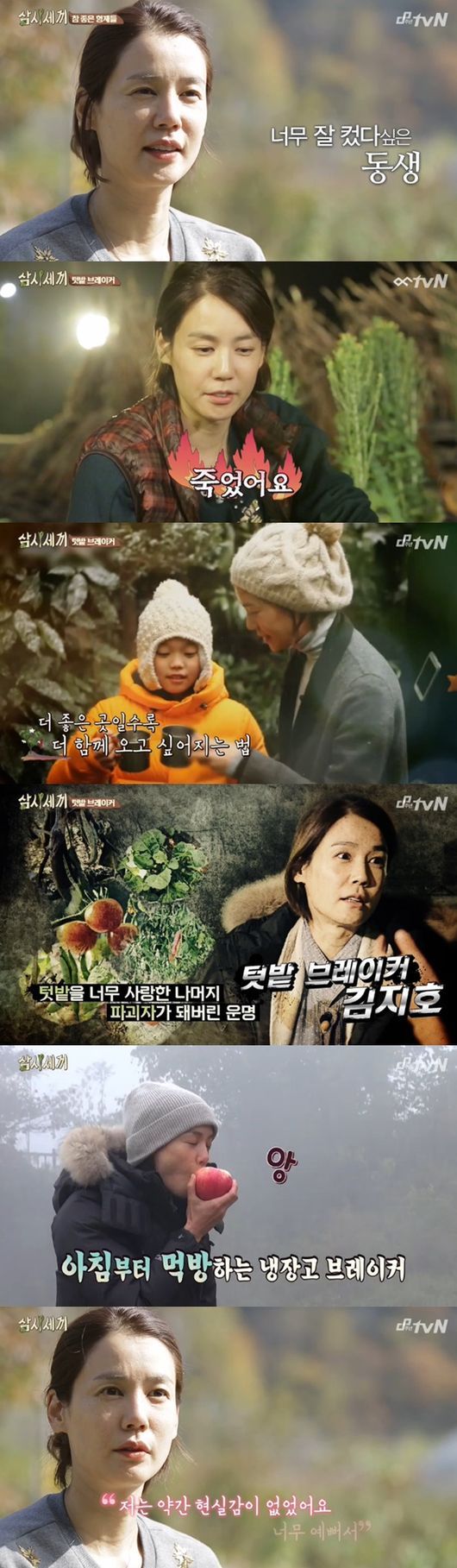 김지호는 7일 오후 방송된 케이블채널 tvN '삼시세끼'에 새로운 게스트로 출연했다. 드라마 ‘참 좋은 시절’을 통해 인연을 맺은 옥택연, 이서진, 김광규는 김지호의 깜짝 등장에 반색하며 환영했다.