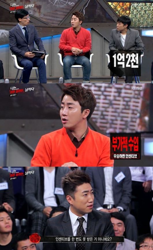 홍진호는 7일 오후 방송된 KBS 2TV 예능프로그램 '나는 남자다'에서 "1년 연봉이 1억 2천, 3년에 3억 6천이었다"고 말했다.