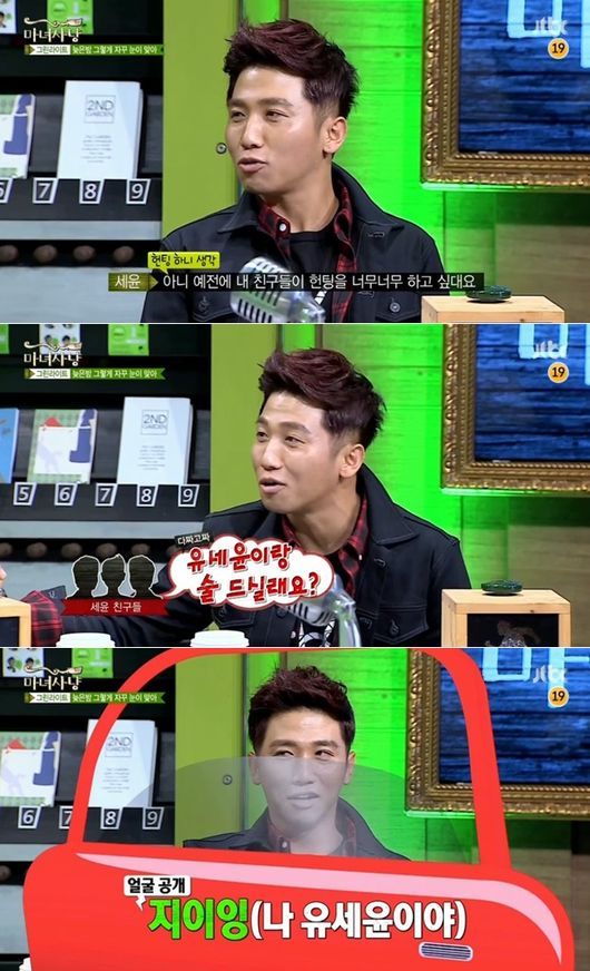 그는 “친구들이 차 안에서 ‘유세윤이랑 술 드실래요?’하면 상대가 ‘유세윤이 호프집 냈어요?’라고 하더라”며, “친구가 ‘내 친구 유세윤이다’라고 하면 나는 선팅 된 차 안에서 기다리고 있다가 창문을 내렸다가 다시 올렸다”고 설명해 웃음을 자아냈다.
