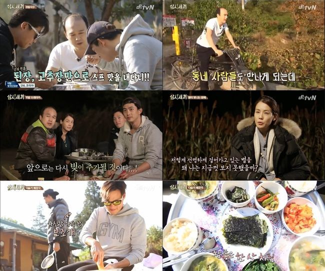 한편, 배낭여행프로젝트 '꽃보다' 시리즈 나영석 PD의 새 예능프로그램 '삼시세끼'는 도시에서 쉽게 해결할 수 있는 '한 끼' 때우기를 낯설고 한적한 시골에서 가장 어렵게 해 보는 야외 버라이어티 프로그램. 매주 금요일 오후 9시 50분 방송된다.