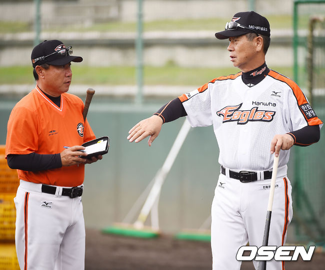 8일 오전 일본 오키나와 고친다 구장에서 한화 이글스 2014 마무리 캠프가 진행됐다. 김성근 감독이 김광수 수석 코치에게 지시를 내리고 있다.