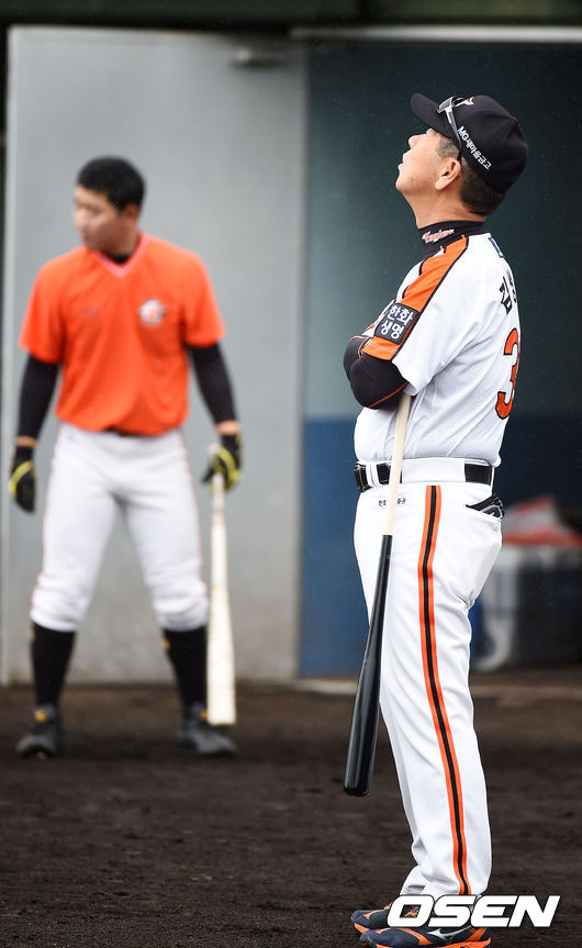 8일 오전 일본 오키나와 고친다 구장에서 한화 이글스 2014 마무리 캠프가 진행됐다. 김성근 감독이 비가 내리는 하늘을 바라보고 있다.