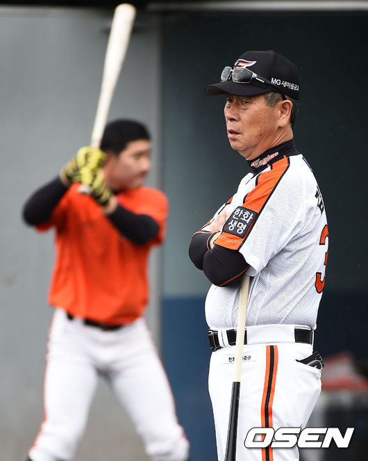 8일 오전 일본 오키나와 고친다 구장에서 한화 이글스 2014 마무리 캠프가 진행됐다. 김성근 감독이 선수들의 훈련을 지켜보고 있다.
