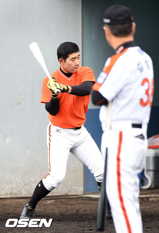 8일 오전 일본 오키나와 고친다 구장에서 한화 이글스 2014 마무리 캠프가 진행됐다. 주현상이 타격 연습을 할때 김성근 감독이 지켜보고 있다.