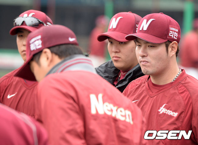 8일 오후 서울 목동야구장에서 열린 '2014 한국야쿠르트 세븐 프로야구 포스트시즌' 넥센 히어로즈와 삼성 라이온즈의 한국시리즈 4차전, 경기에 앞서 넥센 박병호가 선수단과 미팅을 하고 있다.