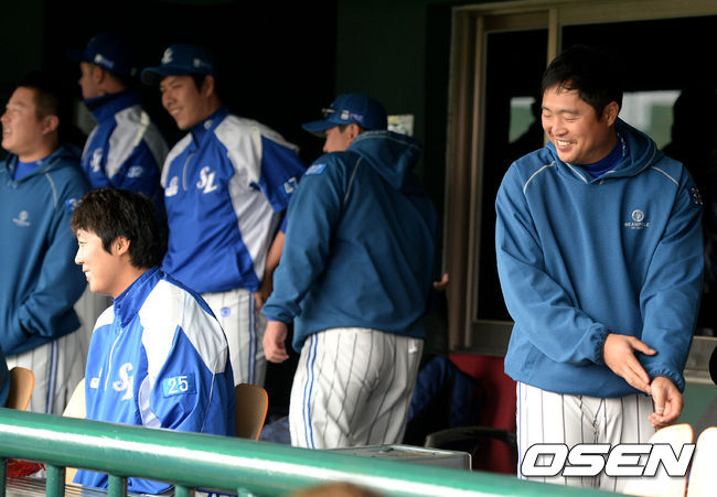 8일 오후 서울 목동야구장에서 열린 '2014 한국야쿠르트 세븐 프로야구 포스트시즌' 넥센 히어로즈와 삼성 라이온즈의 한국시리즈 4차전, 경기에 앞서 삼성 박한이가 더그아웃에 들어서며 미소짓고 있다.