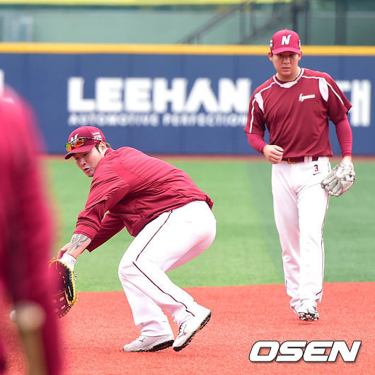 8일 오후 서울 목동야구장에서 열리는 '2014 한국야쿠르트 세븐 프로야구 포스트시즌' 넥센 히어로즈와 삼성 라이온즈의 한국시리즈 4차전, 경기 시작을 앞두고 넥센 박병호와 김민성이 수비 훈련을 하고 있다.