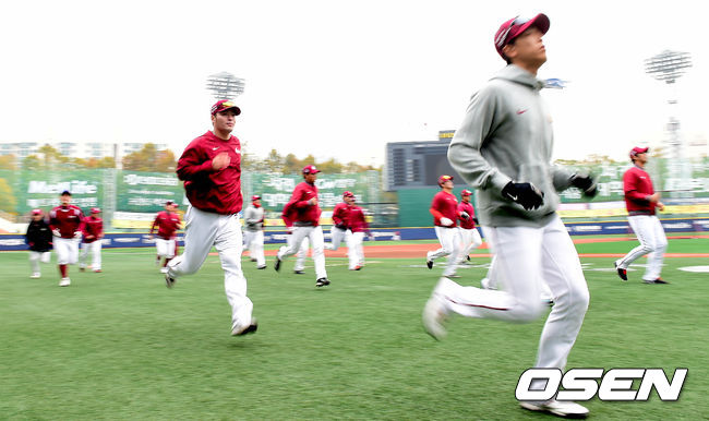8일 오후 서울 목동야구장에서 열리는 '2014 한국야쿠르트 세븐 프로야구 포스트시즌' 넥센 히어로즈와 삼성 라이온즈의 한국시리즈 4차전, 경기 시작을 앞두고 넥센 선수들이 달리기로 몸을 풀고 있다.