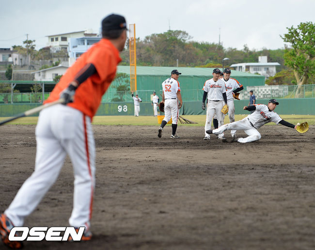 8일 오전 일본 오키나와 고친다 구장에서 한화 이글스 2014 마무리 캠프가 진행됐다. 김성근 감독이 직접 펑고를 치는 펑고를 김태완이 몸을 날려 잡아내고 있다.