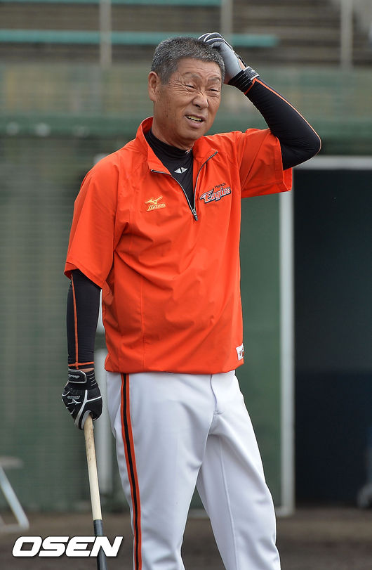 8일 오전 일본 오키나와 고친다 구장에서 한화 이글스 2014 마무리 캠프가 진행됐다. 김성근 감독이 직접 펑고를 치며 안타까운 표정을 짓고 있다.