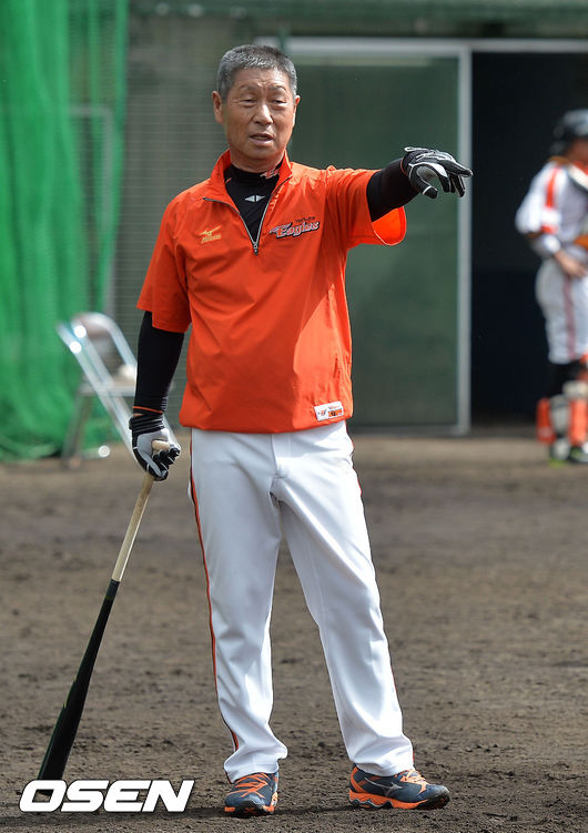 8일 오전 일본 오키나와 고친다 구장에서 한화 이글스 2014 마무리 캠프가 진행됐다. 김성근 감독이 직접 친 펑고를 잡은 김태균에게 다시 지시를 내리고 있다.