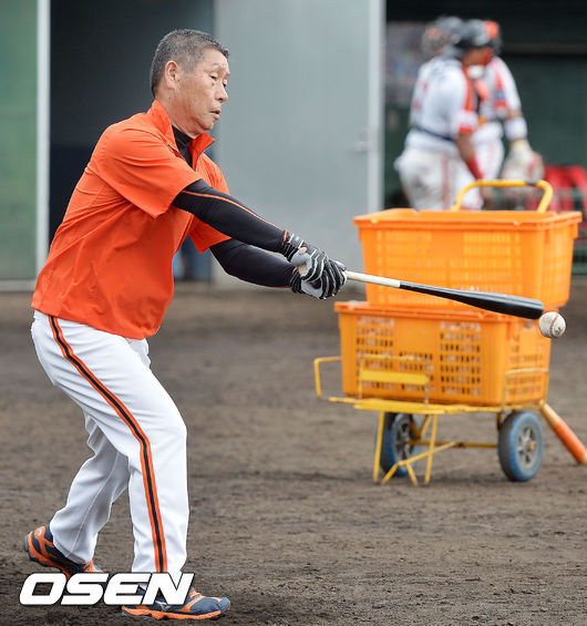 8일 오전 일본 오키나와 고친다 구장에서 한화 이글스 2014 마무리 캠프가 진행됐다. 김성근 감독이 한화 부임 후 처음으로 직접 펑고를 치고 있다.