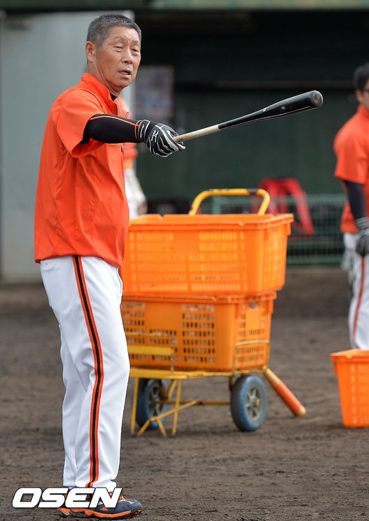 8일 오전 일본 오키나와 고친다 구장에서 한화 이글스 2014 마무리 캠프가 진행됐다. 김성근 감독이 한화 부임 후 처음으로 직접 펑고를 치며 말을 하고 있다.