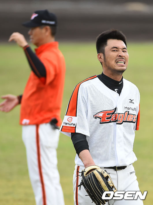 8일 오전 일본 오키나와 고친다 구장에서 한화 이글스 2014 마무리 캠프가 진행됐다. FA를 앞두고 훈련에 자원한 김경언이 김성근 감독이 훈련을 받으며 고통스러워 하고 있다.