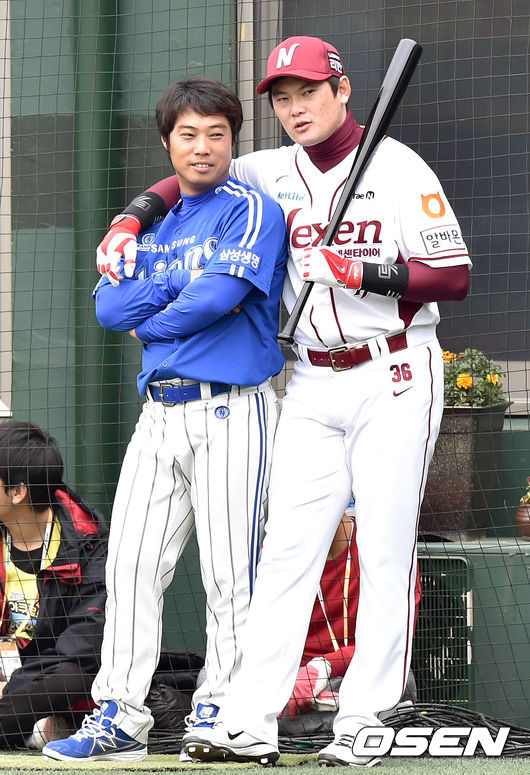 8일 오후 서울 목동야구장에서 열린 '2014 한국야쿠르트 세븐 프로야구 포스트시즌' 넥센 히어로즈와 삼성 라이온즈의 한국시리즈 4차전, 경기에 앞서 삼성 김태완과 넥센 이성열이 어깨동무를 하고 이야기를 나누고 있다.
