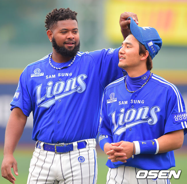 8일 오후 서울 목동야구장에서 열린 '2014 한국야쿠르트 세븐 프로야구 포스트시즌' 넥센 히어로즈와 삼성 라이온즈의 한국시리즈 4차전, 경기에 앞서 삼성 나바로와 김상수가 장난을 치고 있다.