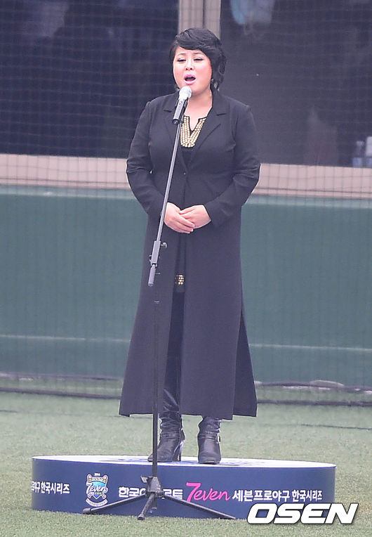 경기 시작을 앞두고 뮤지컬배우 홍지민이 애국가를 제창하고 있다.