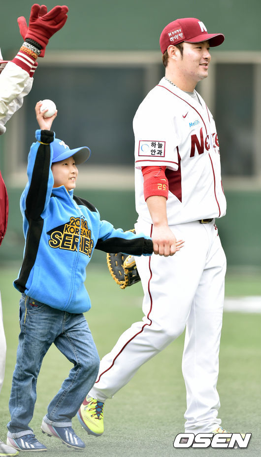 8일 오후 서울 목동야구장에서 열린 '2014 한국야쿠르트 세븐 프로야구 포스트시즌' 넥센 히어로즈와 삼성 라이온즈의 한국시리즈 4차전, 경기에 앞서 시구를 한 박주상 어린이가 박병호와 손을 잡고 활짝 웃고 있다.