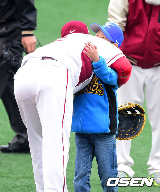 8일 오후 서울 목동야구장에서 열린 '2014 한국야쿠르트 세븐 프로야구 포스트시즌' 넥센 히어로즈와 삼성 라이온즈의 한국시리즈 4차전, 경기에 앞서 급성림프구성백혈병과 투병 중인 박주상 어린이가 시구를 마치고 넥센 박병호와 포옹을 하고 있다.