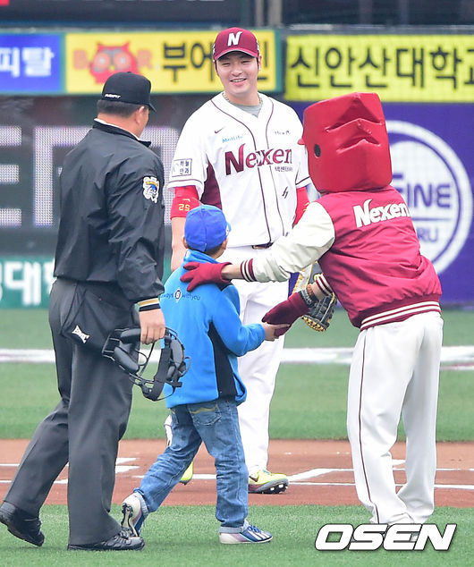 박병호가 급성림프구성백혈병으로 투병중인 박주상 어린이의 시구를 받고 환하게 미소짓고 있다.