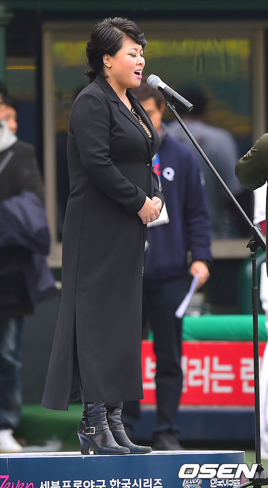 8일 오후 서울 목동야구장에서 열린 '2014 한국야쿠르트 세븐 프로야구 포스트시즌' 넥센 히어로즈와 삼성 라이온즈의 한국시리즈 4차전, 경기에 앞서 뮤지컬 배우 홍지민이 애국가를 부르고 있다.