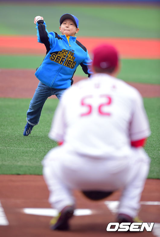 8일 오후 서울 목동야구장에서 열린 '2014 한국야쿠르트 세븐 프로야구 포스트시즌' 넥센 히어로즈와 삼성 라이온즈의 한국시리즈 4차전, 경기에 앞서 백혈병 투병중인 박주상 어린이가 시구를 하고 있다.