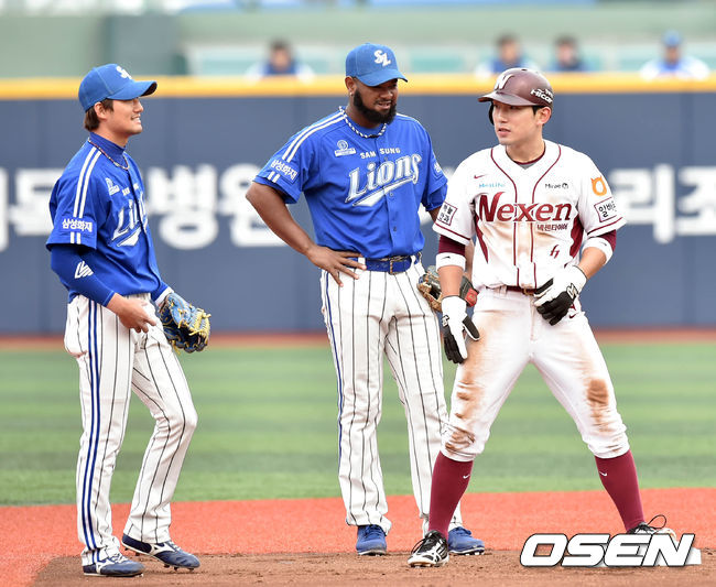 8일 오후 서울 목동야구장에서 열린 '2014 한국야쿠르트 세븐 프로야구 포스트시즌' 넥센 히어로즈와 삼성 라이온즈의 한국시리즈 4차전, 1회말 서건창이 도루를 시도 세이프가 선언되자 김상수가 아쉬워하고 있다.