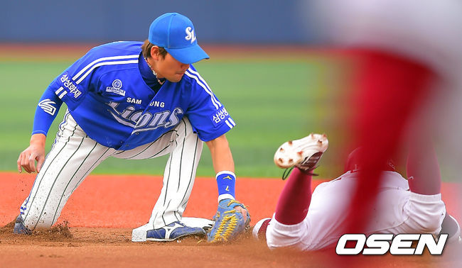 8일 오후 서울 목동야구장에서 열린 '2014 한국야쿠르트 세븐 프로야구 포스트시즌' 넥센 히어로즈와 삼성 라이온즈의 한국시리즈 4차전, 1회말 무사 1루 넥센 이택근의 타석때 1루 주자 서건창이 도루 성공하고 있다.